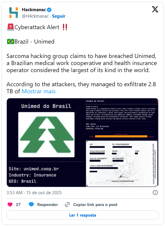 A revelação, que começou a circular em canais especializados em cibersegurança, representa um pesadelo para a privacidade de milhões de pacientes e a estabilidade operacional da cooperativa. Se confirmada, a violação pode se tornar um dos maiores vazamentos de dados de saúde da história do país.